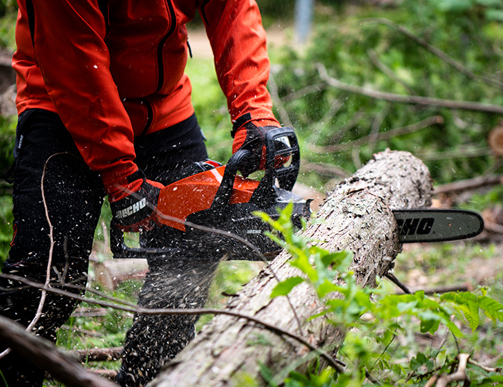 - Elle ne pèse que 2,9 kg (sans guide ni chaîne ni batterie) et est équipée d’un moteur qui génère une puissance comparable à une tronçonneuse thermique de 35-40cm³, ce qui en fait une tronçonneuse à batterie avec un excellent rapport poids/puissance.