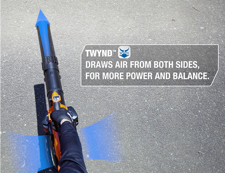 • Nous avons appelé notre nouveau système de prise d’air des 2 côtés TWYND. Prendre de l’air des 2 côtés est synonyme de plus de puissance. Le ventilateur symétrique breveté permet à ce souffleur d’être très fin et compact. TWYND permet également de supprimer l’effet gyroscopique (tendance du souffleur à tourner vers les jambes de l’utilisateur).