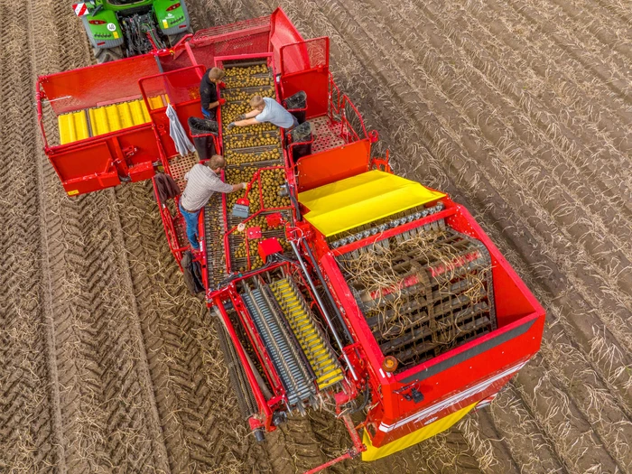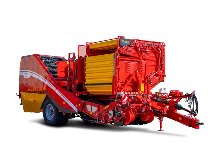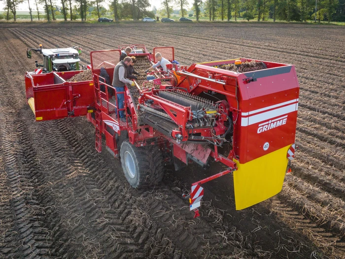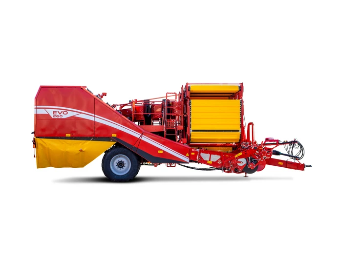 La EVO 260 á deux rangs fait suite à la SE 260. Avec ses 2 séparateurs et sa table de visite spacieuse, elle convient en particulier aux exploitations qui arrachent les produits avec un grand respect et souhaitent trier les pommes de terre à la main dès le champ. Elle convient aux tracteurs à partir de 120 CV et est équipée d’une trémie de 6 t qui est également disponible comme trémie NonstopBunker en option. L’entraînement des chaînes de tamisage et de la chaîne effaneuse à grandes mailles est de série mécanique, celui des séparateurs hydraulique. Un entraînement entièrement hydraulique de l’ensemble des chaînes de tamisage et des séparateurs est disponible en option, qui offre une large gamme de vitesses des chaînes de tamisage pouvant être réglée presque indépendamment de la vitesse de rotation de la prise de force. Grâce à son faible propre poids et à ses pneumatiques radiaux 800/45R30.5 maximum, l’EVO 260 est particulièrement légère, pour un grand respect des sols. Pour pouvoir arracher même dans des conditions défavorables, la roue droite peut être commandée en option en tant que roue motrice. Avec le pupitre de commande ISOBUS de série, la commande de l’EVO 260 est confortable. À l’aide d’une unité de télémétrie, les paramètres des tâches, de la machine et de localisation sont transmis au portail utilisateur myGRIMME ou via « agrirouter » au système d’information sur la gestion agricole de l’exploitation. Une cartographie de rendement géoréférencée est également possible en combinaison avec une balance pour bande transporteuse. Les données peuvent être consultées sur le portail myGRIMME. Grâce au système vidéo SmartView, toutes les fonctions importantes restent constamment sous surveillance.