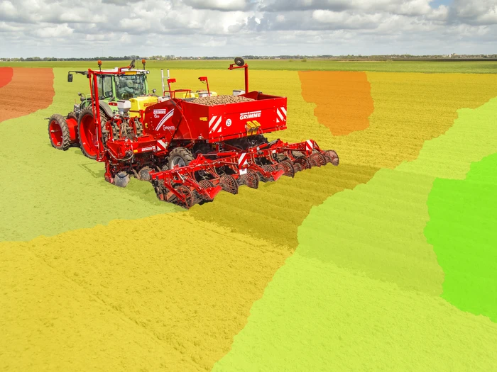 • En utilisant les cartes d’application lors de la plantation de pommes de terre, les distances de plantation peuvent être paramétrées de manière variable sur toute la largeur de la machine et au cm près.