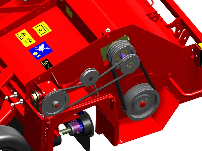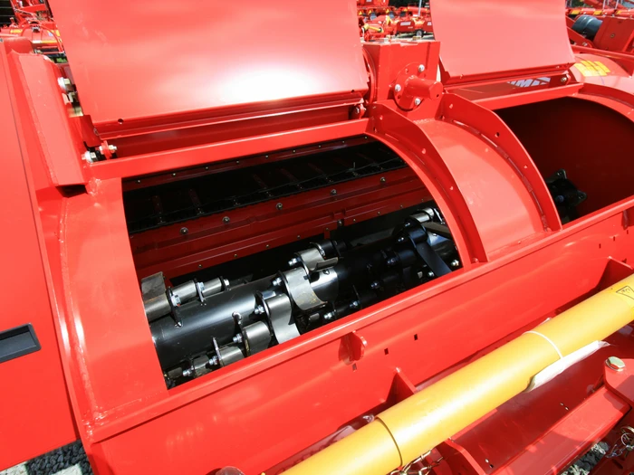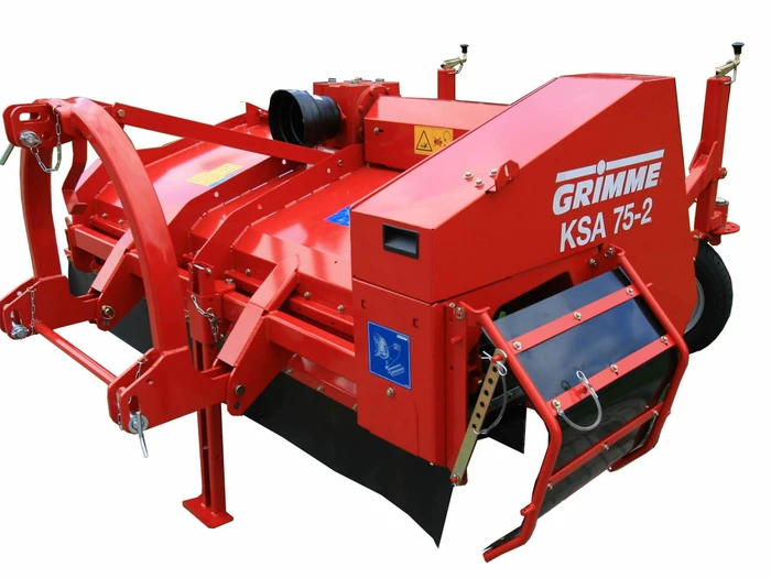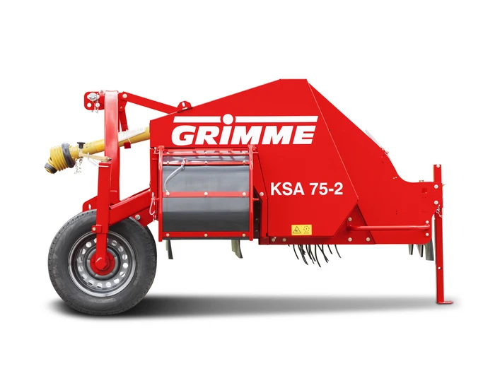 Des méthodes de récolte performantes avec des arracheuses-chargeuses 2 rangs sont d’une importance capitale dans de nombreuses régions. Avec le KSA 75-2, GRIMME propose un broyeur de fanes 2 rangs parfaitement assorti avec évacuation latérale des fanes spécialement pour ces arracheuses traînées au centre. La fane de pomme de terre est broyée mécaniquement par un rotor à fléaux grande taille et refoulée à côté des buttes. Avec la dépose latérale, le risque de bourrage au niveau du bâti d’arrachage est nettement réduit et le débit augmente en conséquence. Cela vaut en particulier pour des variétés de pomme de terre modernes, dotées d’une surface d’assimilation énorme pour le rendement sous la forme d’une fane de pomme de terre longue et bien garnie. Autre avantage : la charge plus faible des dispositifs de séparation, ce qui permet de minimiser les pertes de récolte avec une qualité supérieure.