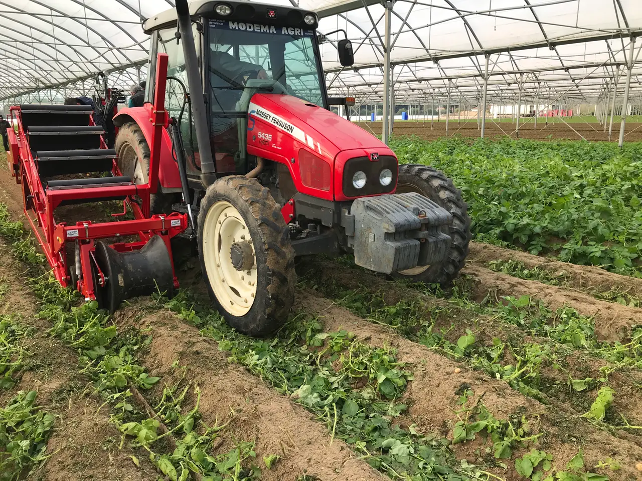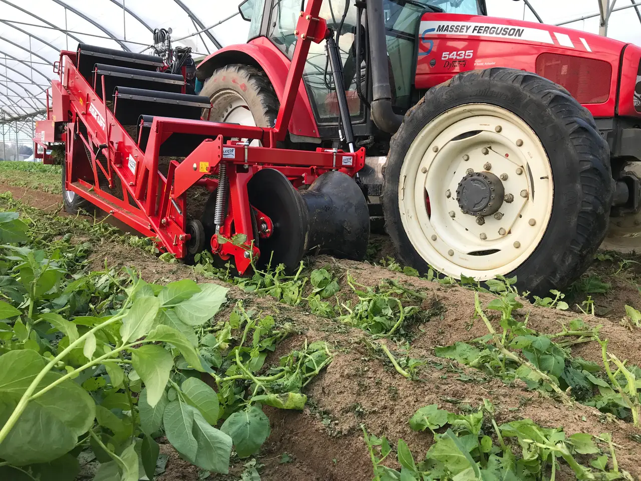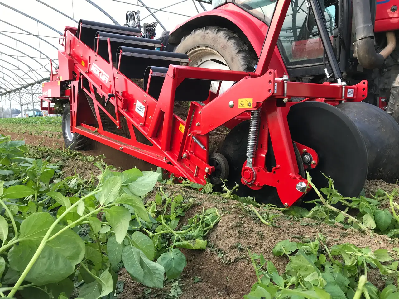 La KT-175 est une arracheuse à bande de tamisage à un rang, portée et légère, sans trémie et sans élévateur de déchargement, pour la récolte en douceur de pommes de terre et de plantes sarclées fragiles. La machine est entraînée par le système hydraulique du tracteur et dotée d’un tapis à tétines horizontal comme séparateur de pierres et de mottes. Poste de triage avec de la place pour 2 à 4 personnes. Au bout de la table de visite, le produit récolté est chargé directement dans de grandes caisses allant jusqu’à 750 kg. Différents systèmes de caisses peuvent être choisis en option. Pour le ramassage, un diabolo est utilisé en combinaison avec des galets tire-fanes et des bineuses à doigts. Le tamisage est effectué sur une chaîne de tamisage de 75 cm de large. Une unité avec secoueur est également installée pour séparer la terre meuble derrière la chaîne de tamisage. Le mode de construction portée entraîne une bonne maniabilité en bordure de champ.